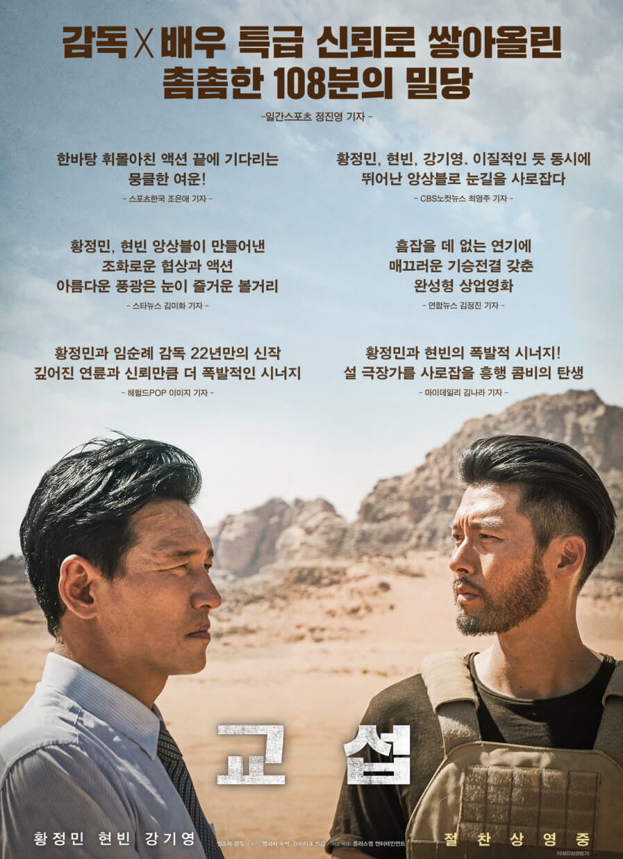 영화 교섭에서 등장하는 배우들의 눈빛, 열연이 단연 최고였다. CG로는 절대 만들어 낼 수 없는 풍경을 담기 위하여 요르단 촬영을 감행했고 더 많은 볼거리를 자아냈다. 특히 모래바람 속 배우들의 연기는 관람객들의 시선을 사로잡기에 충분했다. 특히나 현지에서의 적응력이 높은 현빈의 등장과 인질을 구출하기 위하여 열연하는 황정민의 진실된 마음과 그리고 다급한 상황 속 분위기를 부드럽게 풀어내는 강기영은 영화를 이끌어 나가기에 굉장히 매력적으로 보인다. 영화 초반에 서로 다른 방법대로 인질을 구출하기 위하여 신경전을 부리면서도 결국엔 현빈과 황정민의 합의된 생각으로 국가를 설득하기 위하여 뛰어드는 모습이 굉장히 가슴 떨리면서도 궁금증을 자아내는 전개이다. 그러면서도 외교전쟁 영화라고 볼 수 있지만 사실은 휴머니즘에 가까운 작품이다. 인간이 자신의 목숨을 걸고 다른 인간을 구하는 마음에서 휴머미즘이 굉장히 잘 녹아있다. 임순례 감독의 뜨겁고 긴장감 넘치는 연출 안에서 인간을 구해야 한다는 마음들이 등장인물에게서 느껴진다. 그러한 모습은 관람객이 충분히 느꼈을거라 생각한다.